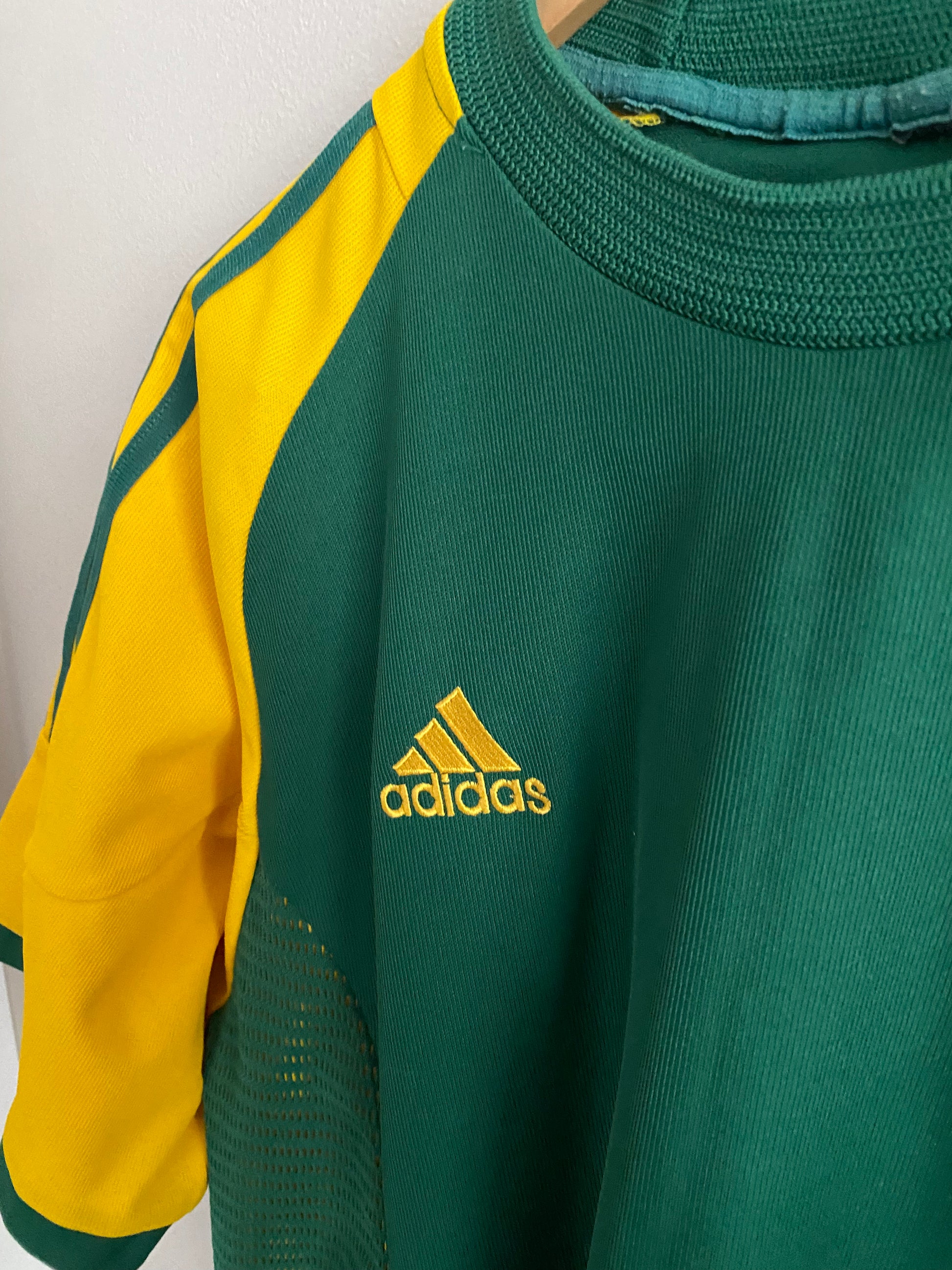 Crafted to perfection, this iconic piece encapsulates the spirit of the Socceroos during their memorable campaigns. The jersey, preserved in excellent condition, boasts the vibrant green and gold colours that symbolise the nation's sporting spirit. Emblazoned proudly on the chest is the emblem of Football Federation Australia, a testament to the team's heritage and dedication to the sport. Whether you're a collector of football memorabilia or a passionate fan looking to relive Australia's historic moments on the pitch, this jersey is a must-have. Jersey is an XL bit fits as a baggy Medium.